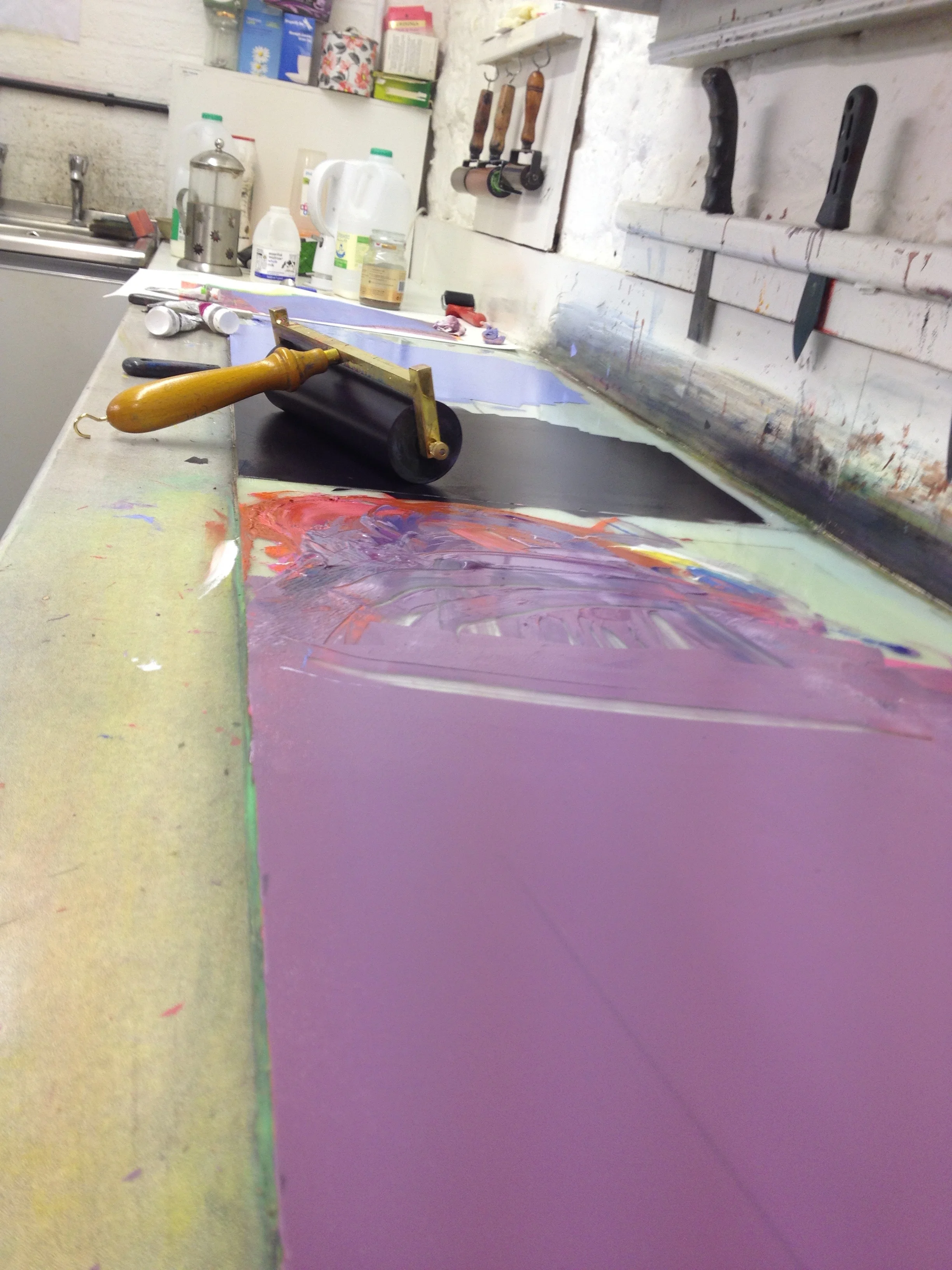 I recently decided to embark on an ambitious 3 colour plate Linocut of Roses. I also wanted to try the design using three different colour combinations, Pink and Blue, Red and Green and Yellow and Purple.