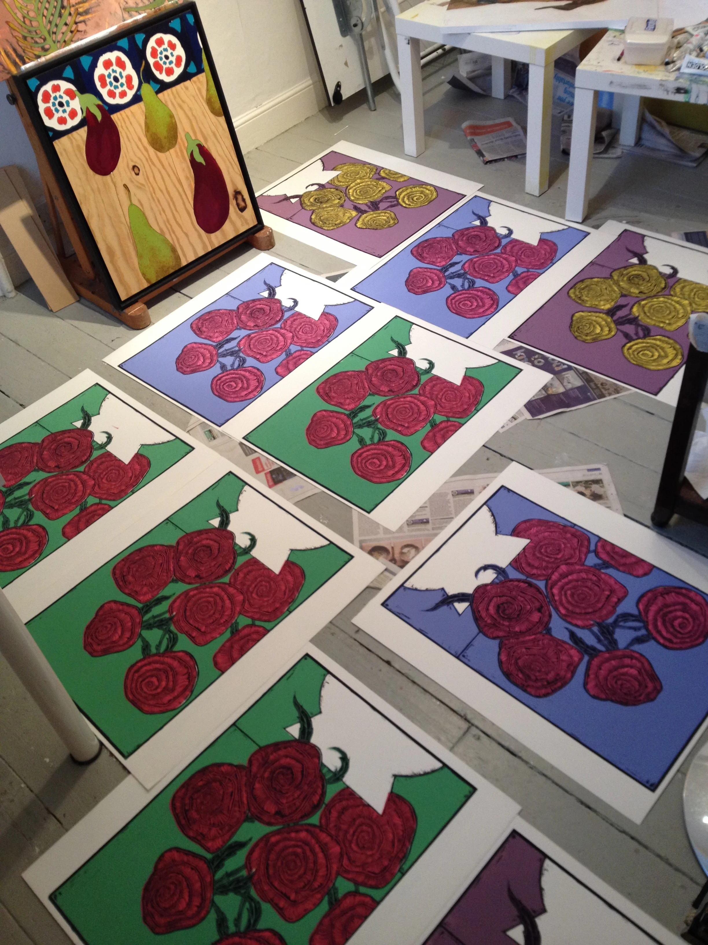 Fortunately as I lay down the prints to dry I realized that the punchy colour combinations had indeed been a success and that the simple design with the intricate spiraling geometric pattern of the Roses worked really well.